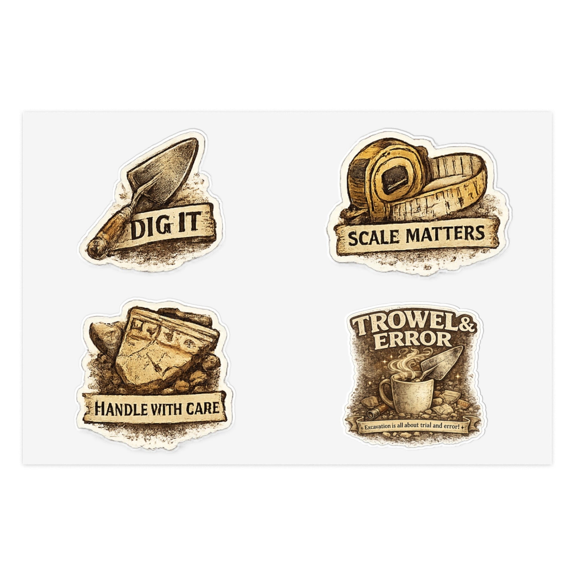 This archaeology sticker sheet features four clever tool-themed designs: 'Dig It', 'Scale Matters', 'Handle With Care', and 'Trowel & Error'. Perfect for archaeologists who appreciate a good pun while excavating the past.