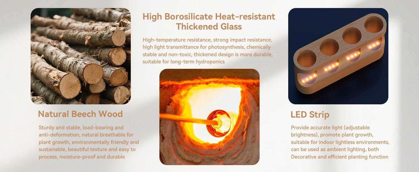 Turn plant propagation into a beautiful display piece. Watch nature work its magic as roots develop in clear glass tubes under optimal LED lighting.