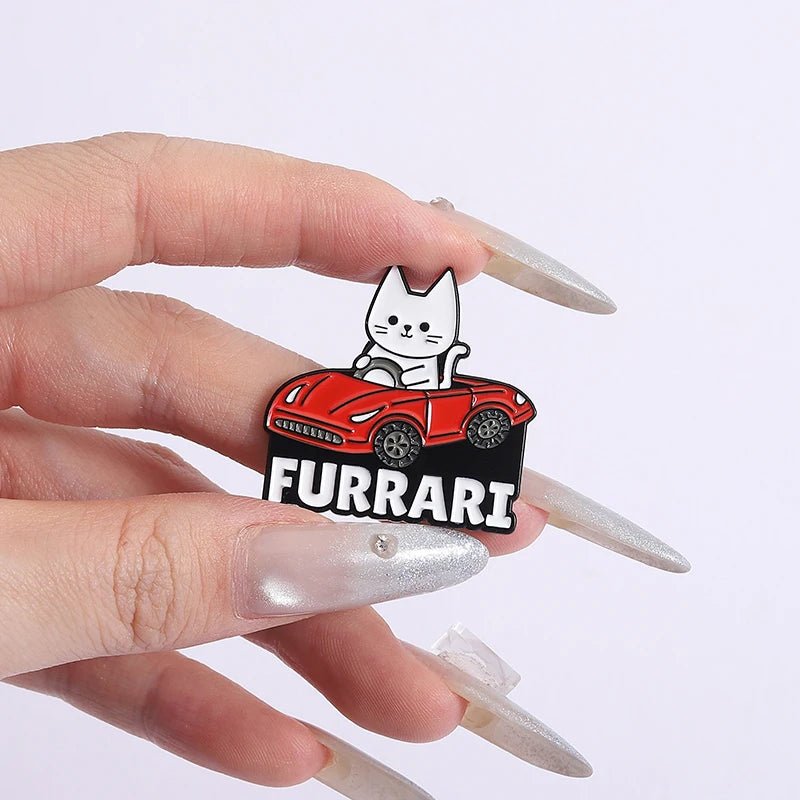 Combine your love of cats and cars with this adorable white cat driving a sports car enamel pin. A humorous and trendy accessory for cat and car enthusiasts!