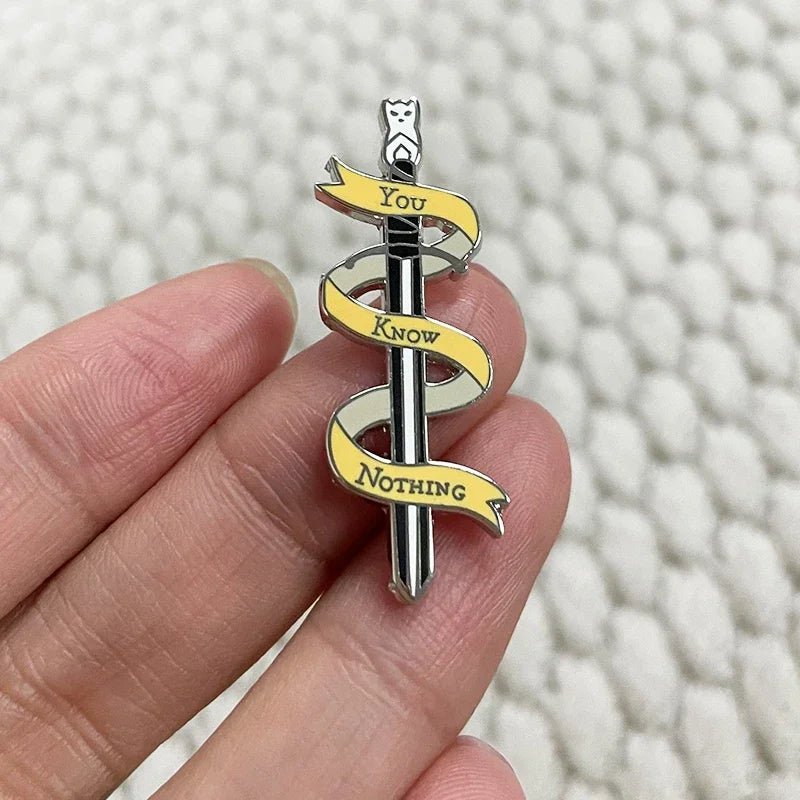 For fans of cats and pop culture! This "You Know Nothing" cat with sword enamel pin is a perfect blend of humour and fandom.