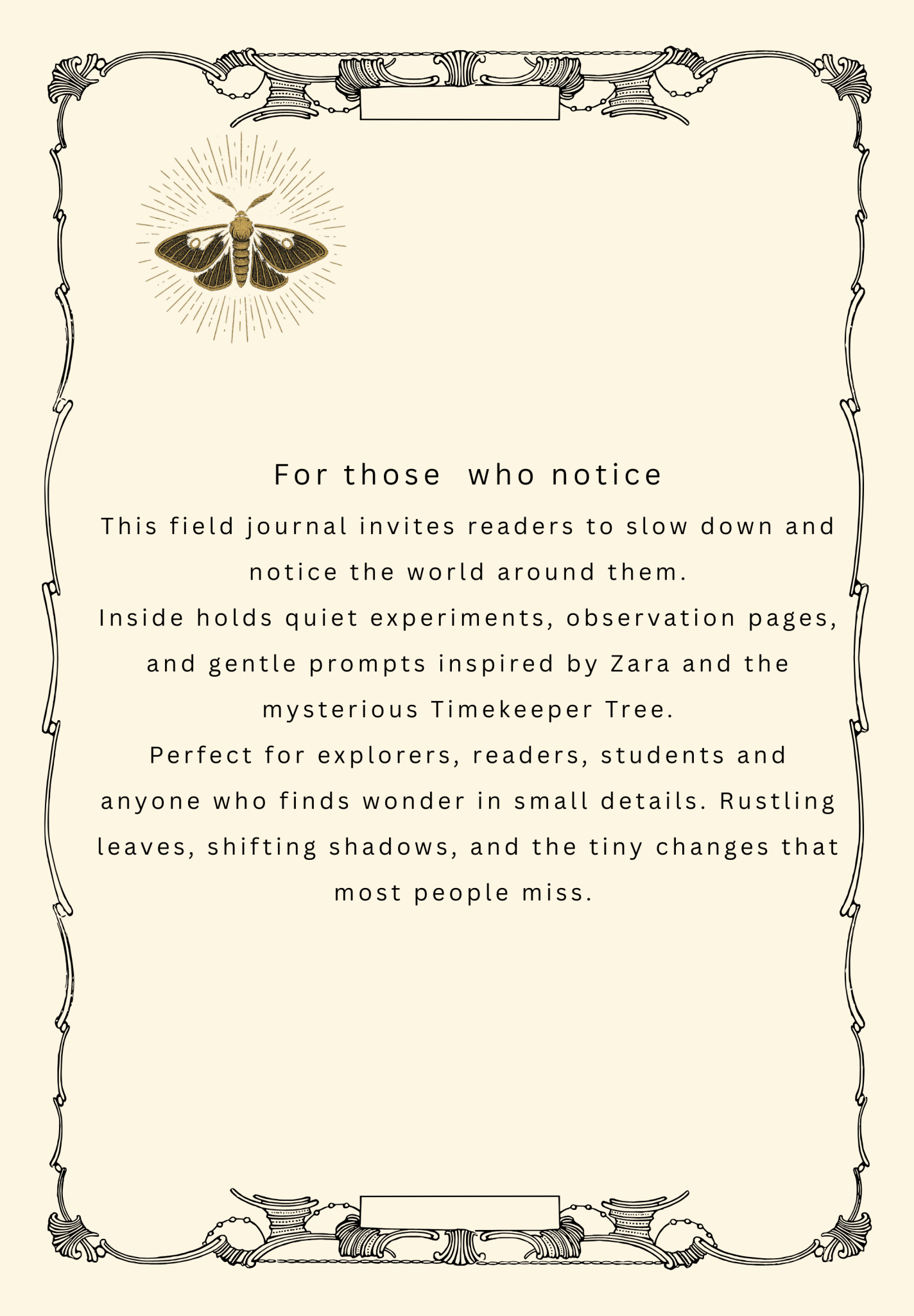 Zara’s Nature Notes is a beautifully designed nature observation journal and field notebook inspired by Zara and the Timekeeper Tree. Created for quiet explorers, curious minds, and careful observers, this 189-page journal encourages readers to slow down and notice the small details that most people miss.